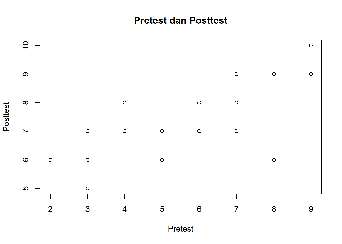 Oleh karena \(t=7.05\) lebih dari nilai kritis \(1.729\) maka \(H_0\) ditolak yang berarti rata-rata nilai pretest kurang dari nilai posttest.