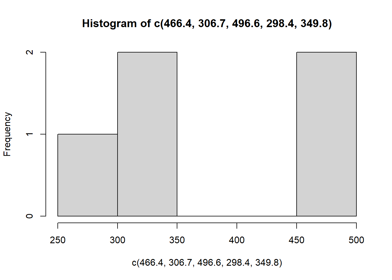 hist(c(466.4, 306.7, 496.6, 298.4, 349.8))